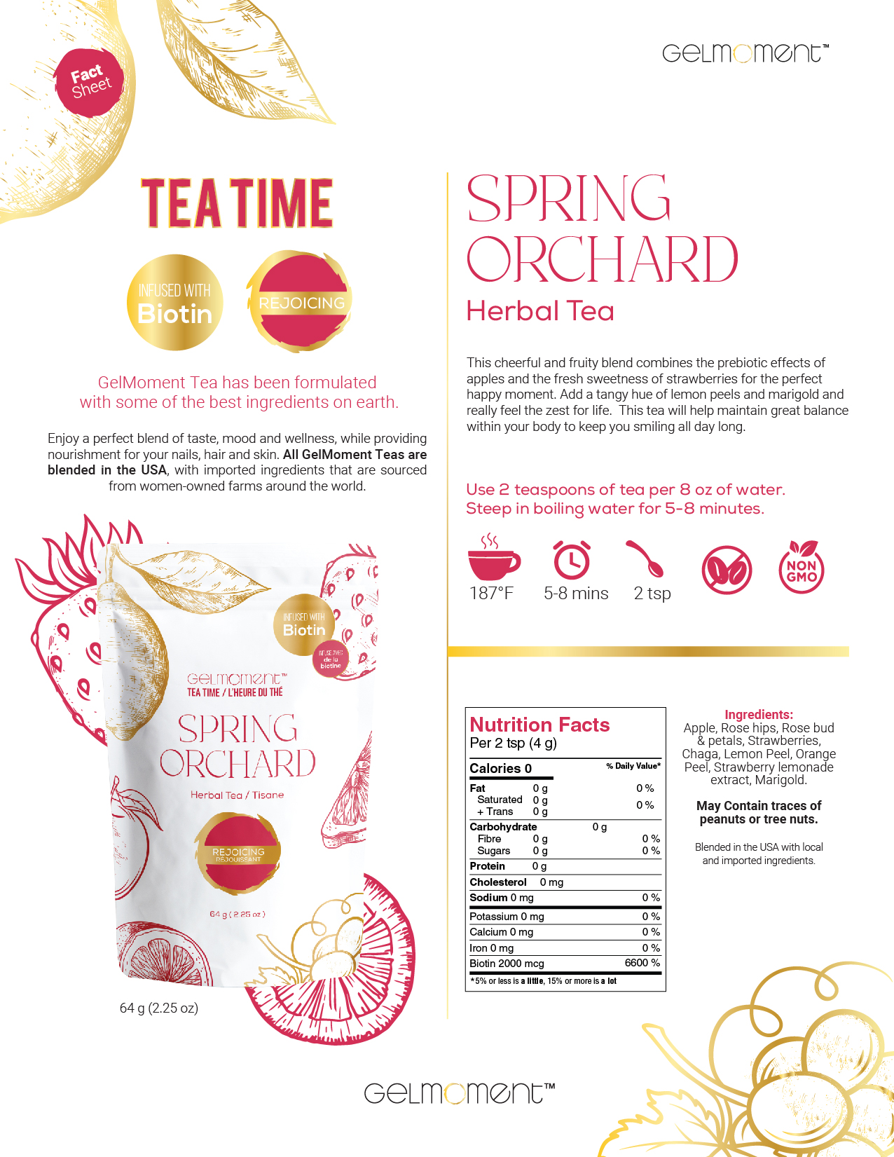 Apple, rose hips, rose bud & petals, strawberries, chaga, lemon peel, orange peel, strawberry lemonade extract, marigold.